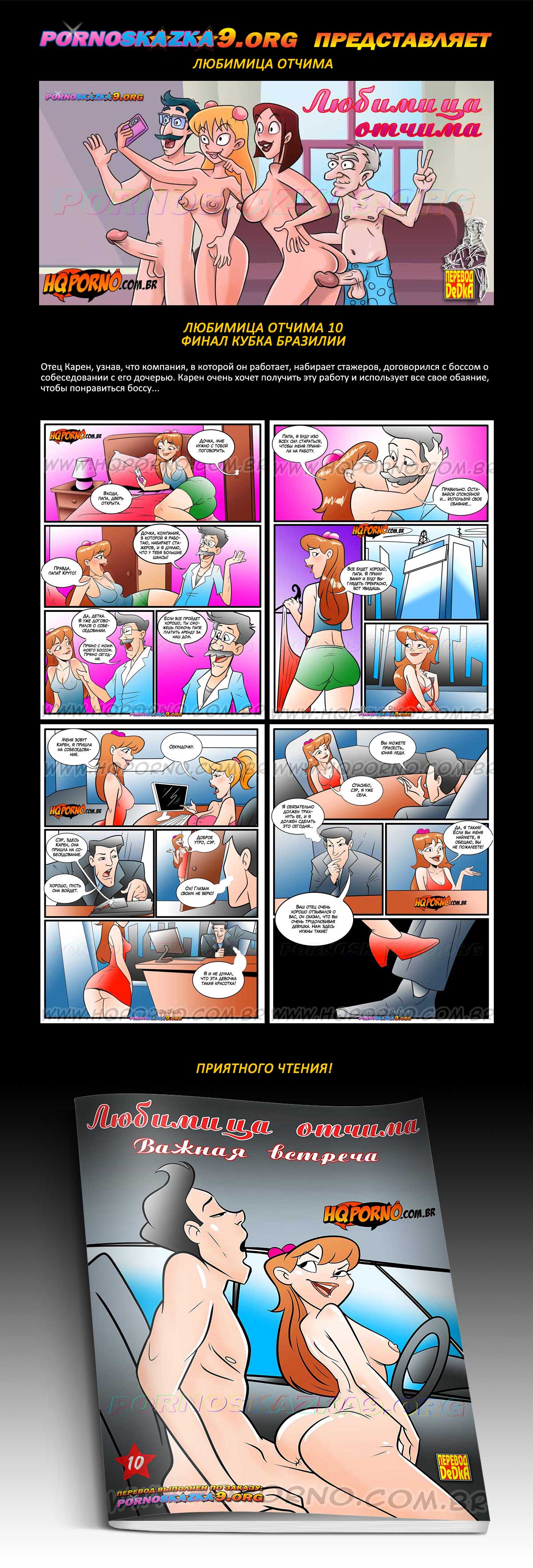 Порно комикс «Любимица отчима. Часть 10. Важная встреча.» Отец Карен, узнав, что компания, в которой он работает, набирает стажеров, договорился с боссом о собеседовании с его дочерью. Карен очень хочет получить эту работу и использует все свое обаяние, чтобы понравиться боссу…